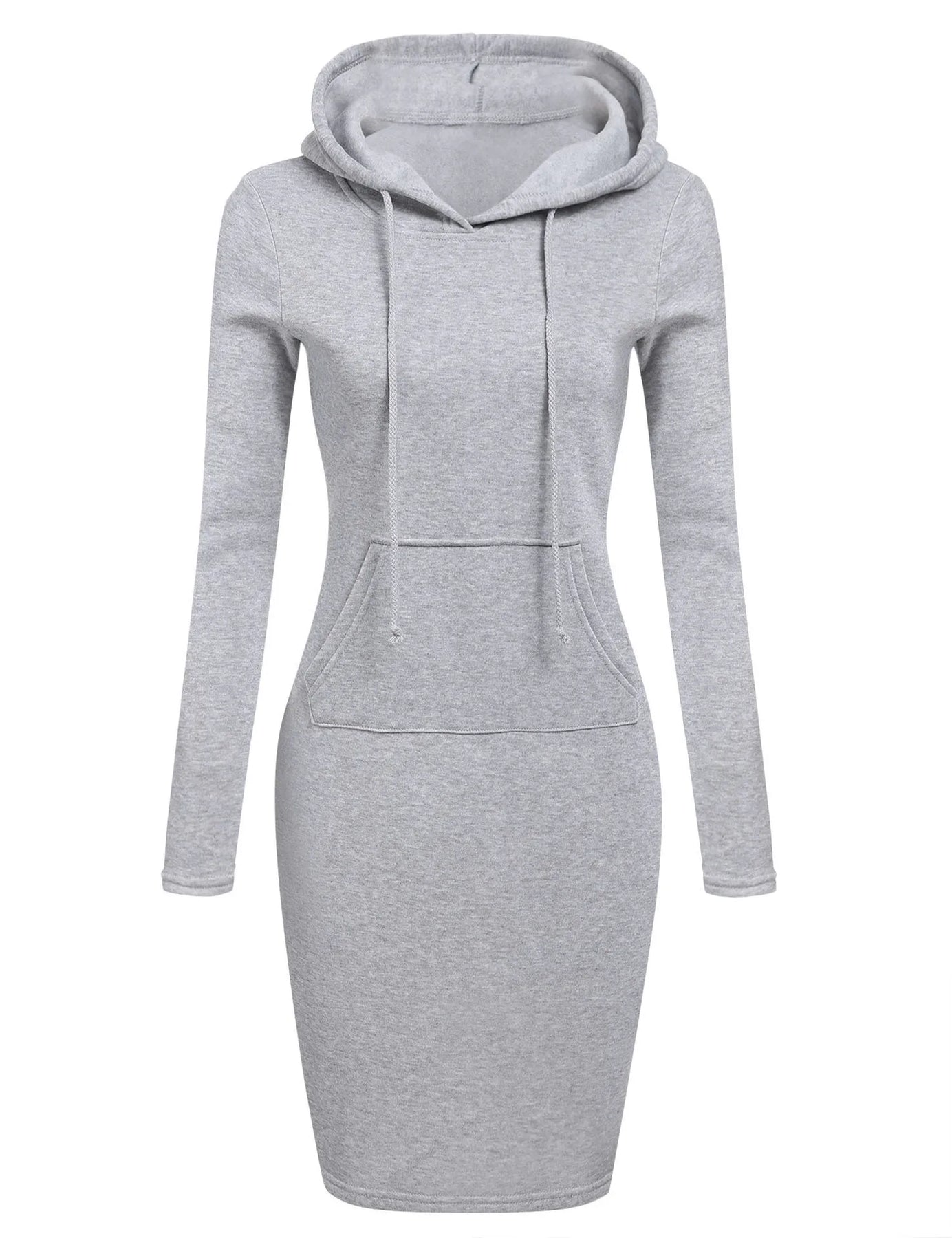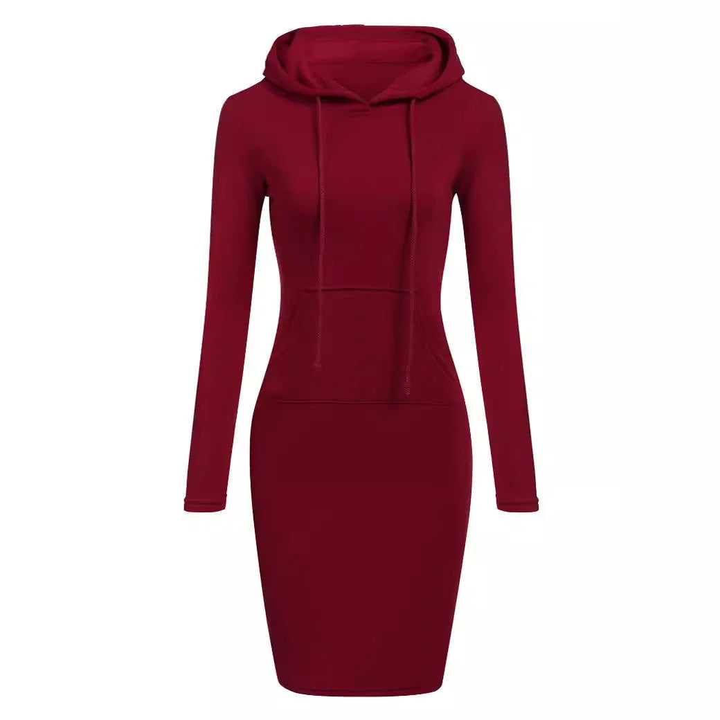 Women’s Autumn Winter Hoodie Dress – Solid Color, Long Sleeve with Pockets