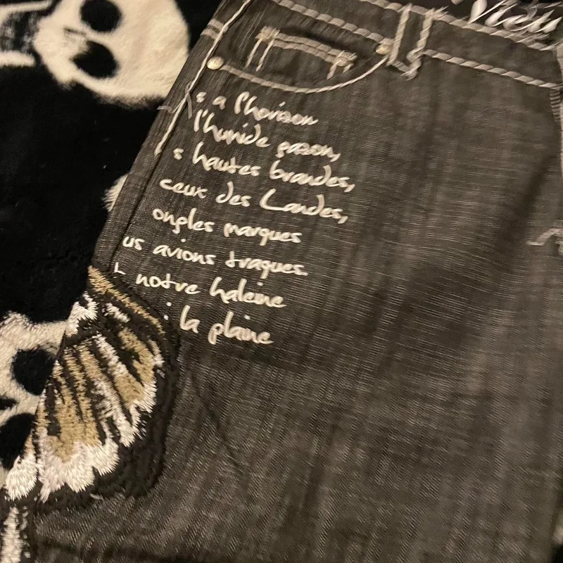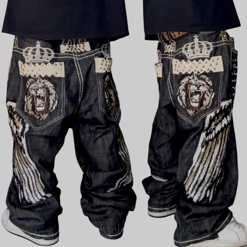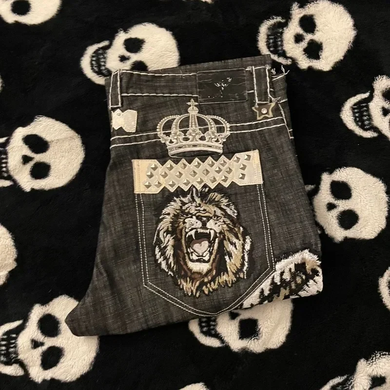 The intricate geometric embroidery patterns add a unique artistic touch, blending influences from gothic, pop, and Y2K culture into one standout design. Crafted from durable denim, they deliver both structure and comfort, while the baggy silhouette enhances mobility and captures the authentic oversized look.