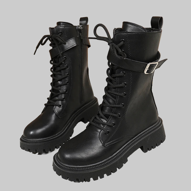 🔥 Mid-calf PU leather combat boots with chunky platform and buckle straps — built for edgy women who love street and motorcycle style.
