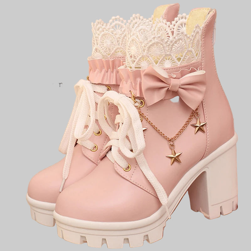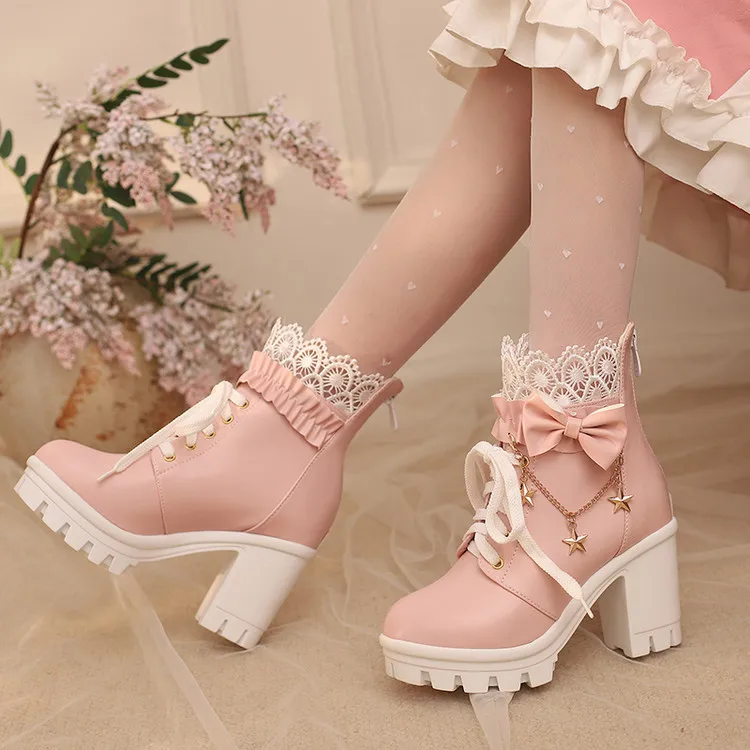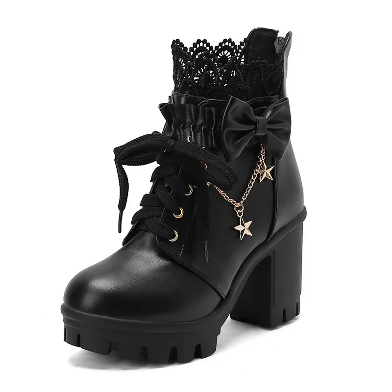 👢 Women’s Ankle Boots – Lace-Up Pearl Chain Bow Platform Boots with Back Zipper & Chunky Heel