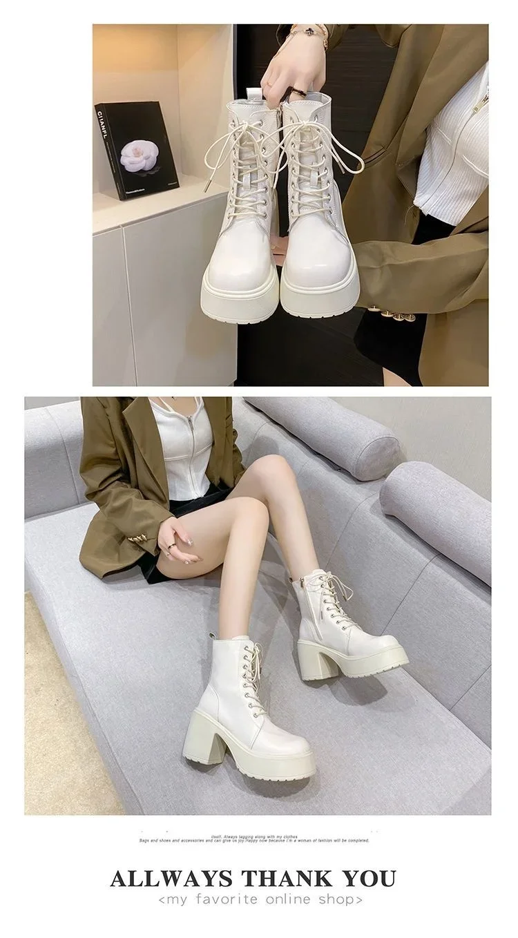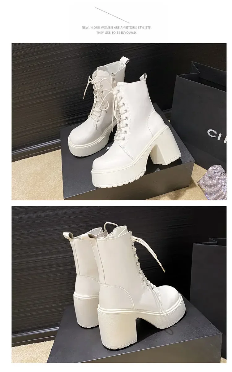 👢 Women’s Retro White Leather Platform Boots – Round Toe High Heel Waterproof Short Booties