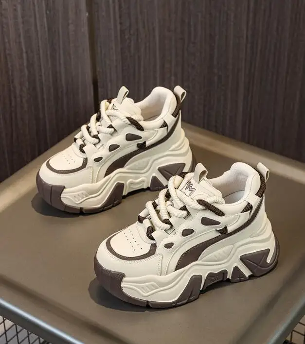 👟⬆️ Women’s 8cm Genuine Leather Sneakers – Chunky White Dad Shoes ✨🤍