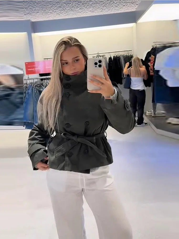 Redefine autumn style with this Belted Waist Cropped Trench Coat, a perfect blend of vintage-inspired tailoring and contemporary chic. With its double-breasted closure, stand (Mandarin) collar, and belted waist, this coat offers a structured yet feminine silhouette ideal for the office, casual outings, or evening wear.
