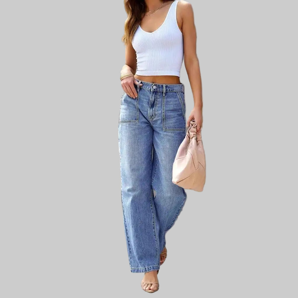 Crafted from a premium blend of cotton, polyester, spandex, linen, viscose, and lyocell, the fabric is soft, breathable, and stretchy, ensuring comfort without sacrificing durability. The garment-wash finish enhances the light blue tone, giving them a relaxed vintage vibe. Complete with functional pockets and a zipper fly closure, these jeans are perfect for pairing with crop tops, blouses, or oversized tees for a cool-girl streetwear look.