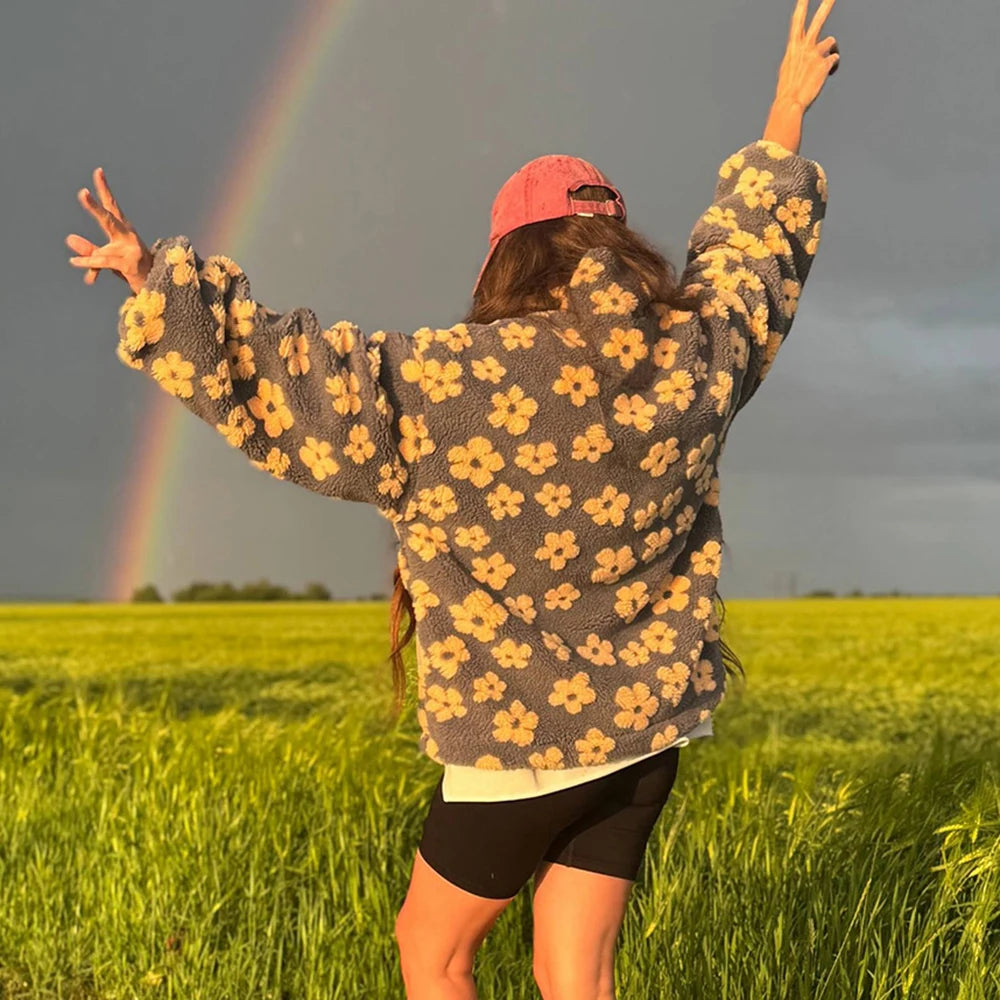 🌸🧸 Women’s Floral Print Imitation Lamb Wool Hoodie – Cozy, Chic & Casual Autumn Holiday Coat 🍂✨
